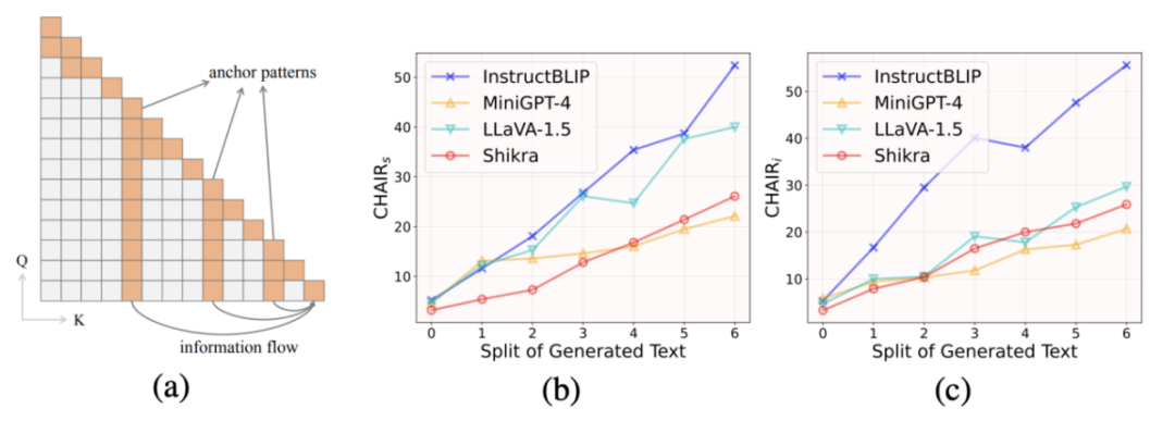 由于现有多模态大模型的基座取自大语言模型,其因果语言模型的特点使其在浅层时将前文 token 的信息聚合到 summary token,同时在深层时主要利用 summary token 中聚合的信息来预测整个序列的下一个 token(见下图图 a)。