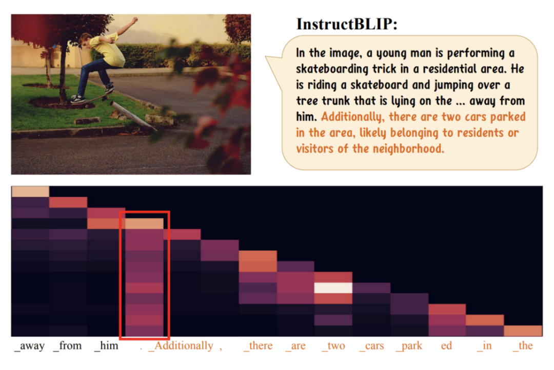为此,中科大等单位的研究人员从可视化模型在推理时的 Self-Attention 权重出发,希望寻找得到一些有趣的结论。他们首先观察到,在模型生成幻觉内容时,最后一层的 Self-Attention 权重大概率会在幻觉部分之前呈现出明显的“柱状”特征,这导致幻觉部分的 Self-Attention 权重表现出一种“过度信赖”的趋势。以多模态大模型 InstructBLIP 为例: