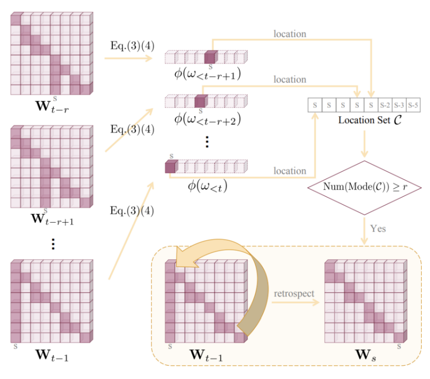 具体来说,可以计算最近几个 token 的得分向量的最大值下标,并检查该下标连续出现的次数是否大于一定阈值。如果高于阈值,则将当前序列的解码过程回退到这一下标所在 token 的位置,并重新选择词表中概率次高的词(除了之前已经选择的词之外)。