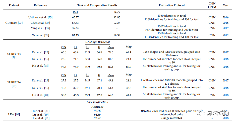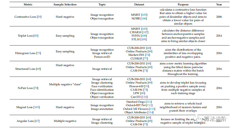 在训练阶段之前,必须为Siamese、Triplet和n-double网络准备训练数据,此过程需要更多磁盘空间并且非常耗时。宋等人提出了一种新的深度度量学习方法,使用聚类损失将样本聚集在一个聚类中(图 6g),防止不同的簇相互接近。里佩尔等人强调三元组损失一次评估一个三元组样本来训练数据集,减少网络的学习时间。然而,这种方法会导致性能不佳和培训不足。因此,他们建议磁体损失,这会惩罚簇重叠并评估簇中最近的邻居以分离多个簇。所提出的方法具有局部区分度,并且与优化过程全局一致。混合损失受到三元组损失的启发,除了anchor和负样本之外,还使用三个正样本和三个负样本来建立样本之间的相似关系。图6h说明了在使用局部邻域时相似样本如何接近最近的集群。表2详细总结了文献中最先进的损失指标。
