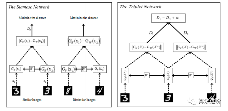 其中Y是标签值,如果输入来自同一类则Y=1,否则Y=0。m是LContrastive中的margin值。三元组网络有三个输入:锚输入X、与X相似的X_p、与X不同的X_n。LTriplet损失是: