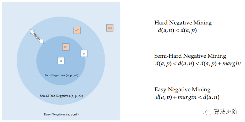 硬负样本是假阳性样本,半硬负挖掘寻找边界内负样本,与硬负样本相比,负样本距离锚样本更远。三元组挖掘根据锚点、正样本和负样本之间的距离进行负挖掘,如图 4 所示。负样本距离锚点太近会导致梯度高方差和低信噪比,建议使用距离加权采样避免噪声样本。负类挖掘使用每个类样本之一作为三重网络的负样本,使用贪婪搜索策略选择多个负样本。