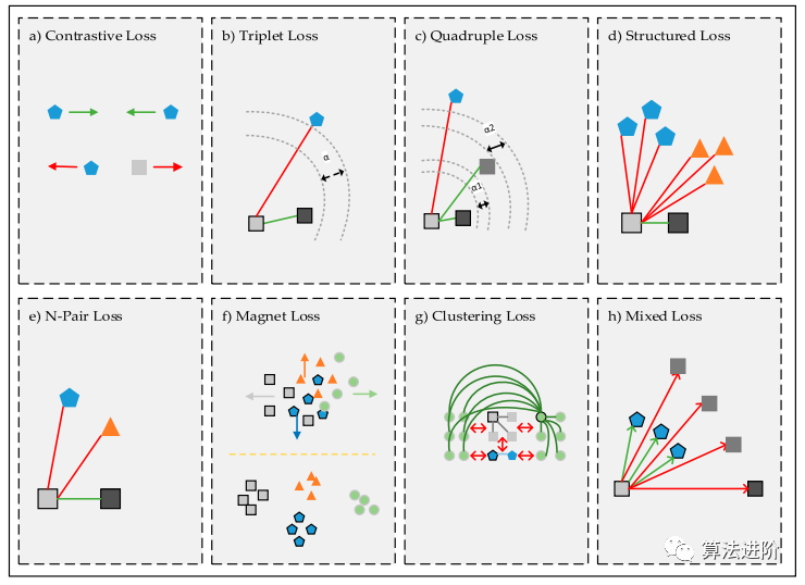 本节将介绍用于应用深度度量学习的损失函数,包括其使用方式和差异。这些函数帮助我们通过调整对象相似性来优化特征表示。