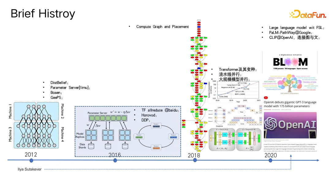 随着深度学习框架如 TensorFlow 的流行以及分布式训练框架的发展,解决大模型问题的方法也在不断演变。初期可能主要聚焦于稀疏场景下的分布式训练优化,之后百度美颜项目将高性能计算(HPC)中的 All-Reduce 技术引入分布式机器学习,用于加速数据并行处理。再后来,诸如 Word2Vec、DDP 等经典操作的出现推动了这一领域的进步。