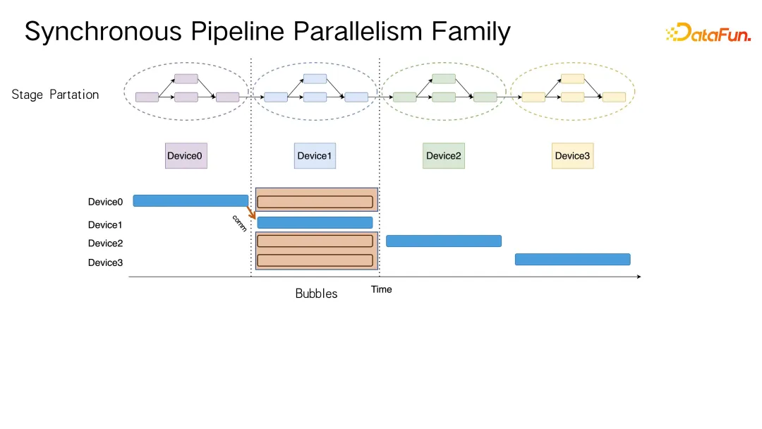 这是一个基本的同步流水线概念,通过将计算图划分成多个 stage,比如这张图展示了四个 stage,并将每个 stage 分配给不同的设备执行,例如 device3 负责某个 stage。