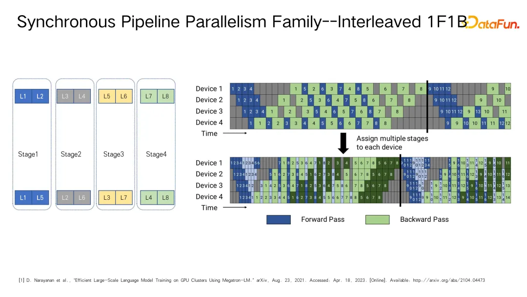 此外,英伟达提出了改进型的工作,在"1F1B"的基础上提出了精细化切分 stage 的方法。不同于先前按连续几层划分 stage 的做法,新的思路是采用 Round Robin 的方式更为细致地分配任务,例如将 8 层网络分为两部分,第一部分从 L1 到 L5,并且在完成一层计算后立即推进至下一设备进行后续计算,从而提高了设备利用率,这种技术被称作交错式(1F1B)流水线方法。