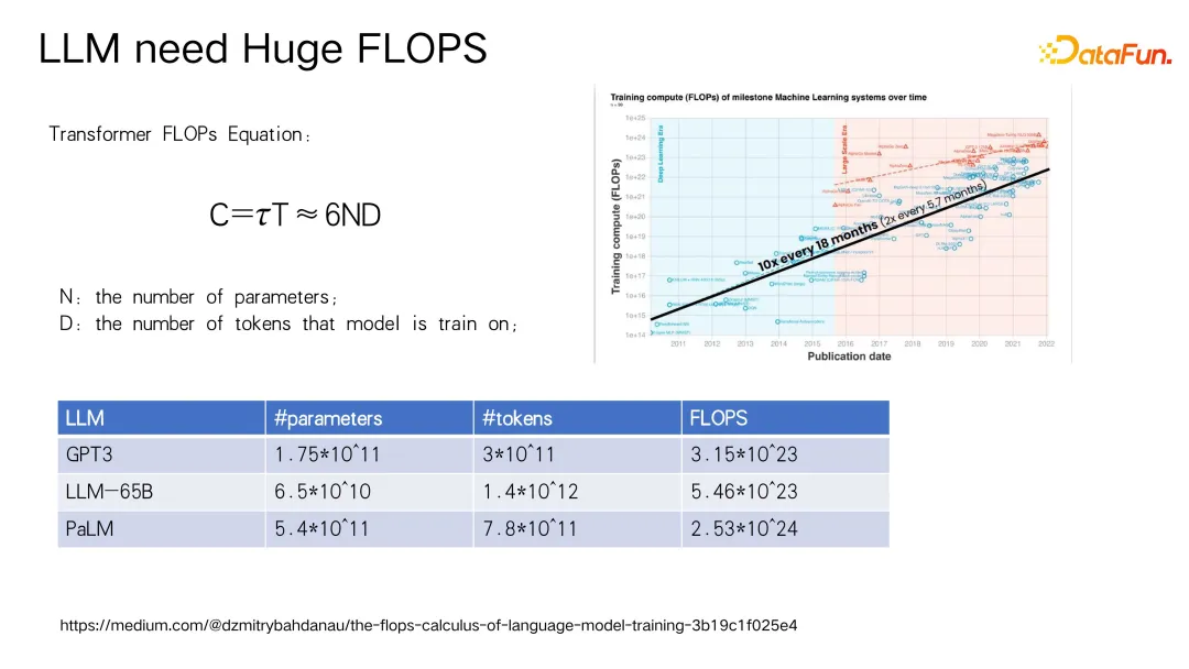第一个关键挑战在于大语言模型对算力的巨大需求。尽管业界普遍认为大模型需要庞大的算力支持,但具体需求量级往往没有被清晰理解。这里提供一个简单的估算公式:模型所需算力大致等于模型参数数量乘以训练时使用的 token 数量的六倍。