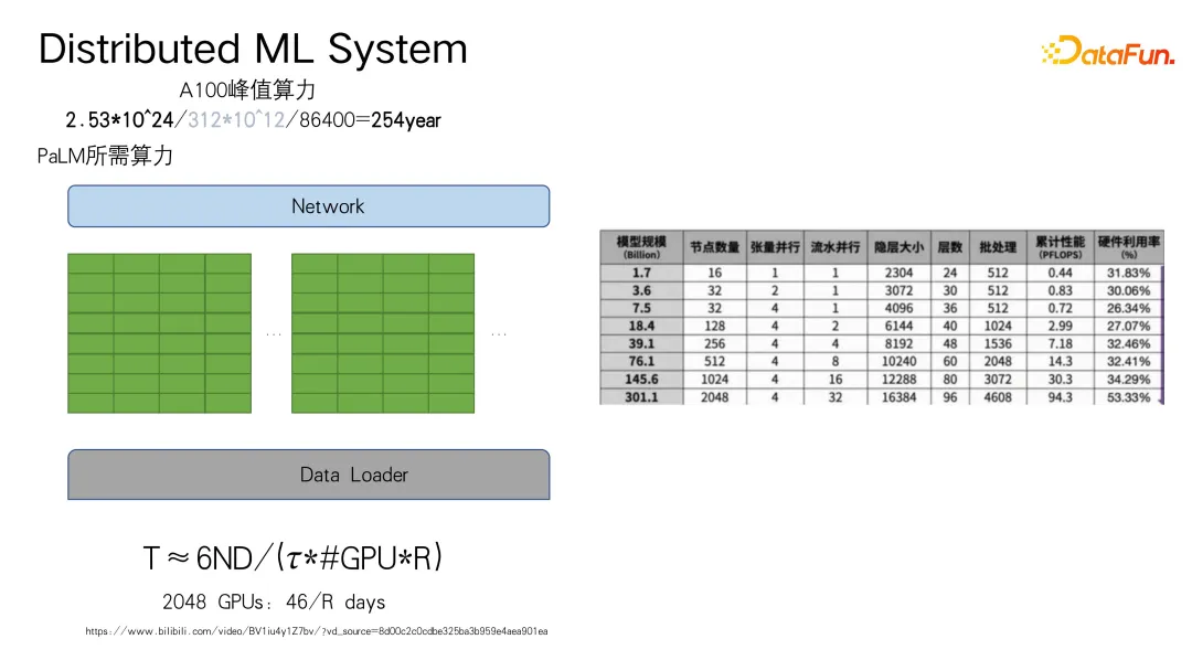 上图右侧表格显示了模型参数规模与单设备硬件利用率之间的关系。通常,模型参数规模越大,硬件利用率越高,因为需要进行更多计算,从而促使利用率得到提升。但在 3000 亿参数规模下,整体利用率仅约为 53%,像 Meta Lab 的 LLM-65B 模型估计利用率可能在 42% 左右。