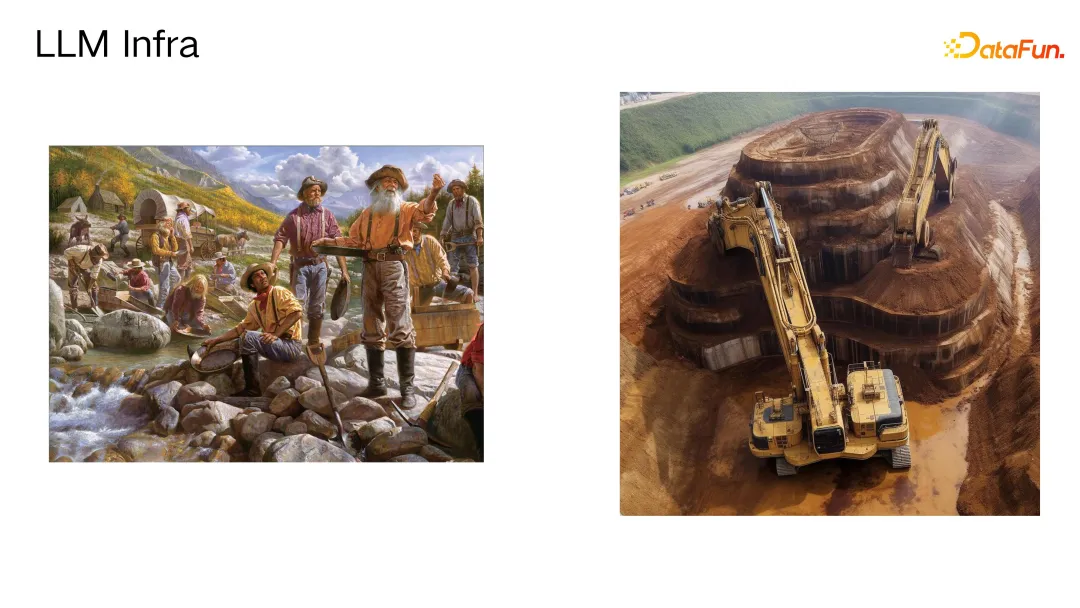 人们将当前大语言模型领域的机遇与淘金热时期相类比,众所周知其中蕴藏着巨大的价值,但如何有效发掘则是一个问题。在过去淘金需要铲子,而现在在大语言模型时代,则需要更高级别的工具——挖掘机。这一比喻实际上揭示了对基础设施建设提出的更高要求。这意味着不仅要有掌握操作挖掘机技术的专业人才,即具备处理和利用大语言模型技能的专业人员,同时还需要配套完善的基础设施,例如,确保挖掘机能够从一个地方转移到另一个地方的运输链路,以及足够的燃料储备。将当前大模型所需的计算能力建设比作淘金热时期所需工具的升级是非常生动贴切的。