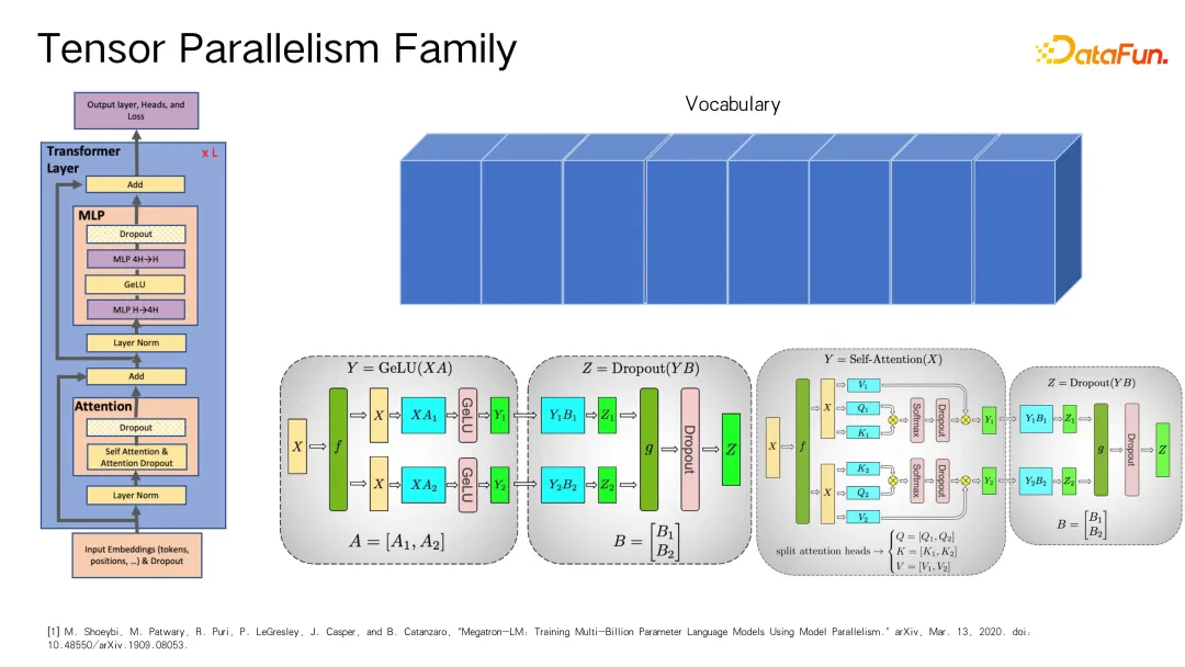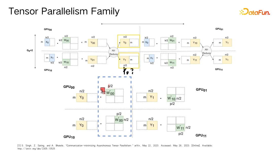 Tensor 运算优化的一项经典工作——m in,强调在处理大规模矩阵计算时(例如数千万个值的矩阵),为了充分挖掘计算能力,可以将矩阵切分并在不同的设备上并行计算。虽然文章没有明确提到这一点,但实际在 m 的实现中,会对 embedding 部分也进行相应的切分处理,以便于后续的 MLP(多层感知机)和 Attention 机制等大矩阵乘法操作。通过合理地在不同设备上分配 tensor 并适时引入通信逻辑,在恰当的时间点进行通讯与结果复用,从而实现对 tensor 变形问题的有效解决。