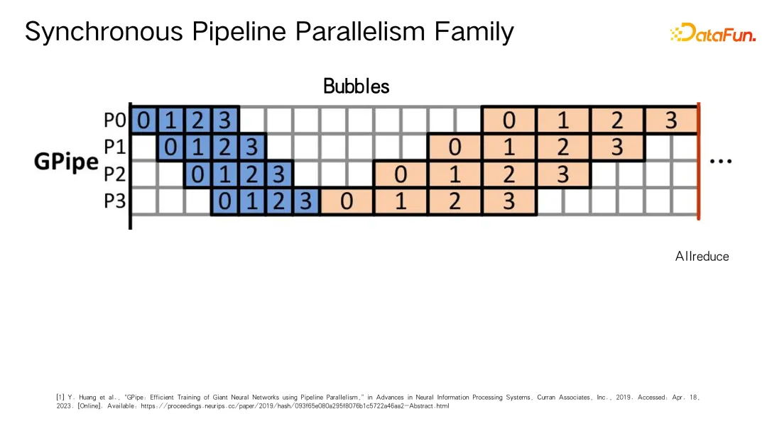 流水线并行可以大致划分为两个部分:同步流水线和异步流水线。同步流水线的核心思想是保持与单机训练行为一致,无论最终并行度如何设置,即每个计算阶段的行为都如同在一单一设备上进行训练时那样,包括前向传播、反向传播及通信等操作。