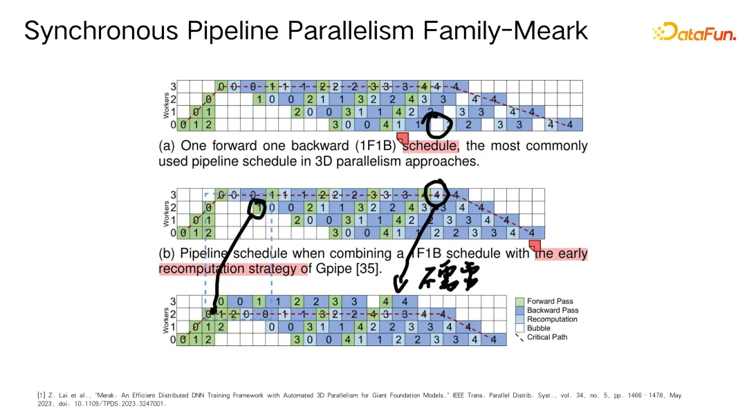 国防科技大学的一项研究则结合了 recompute 技术,发现在流水线并行中的最后一个 stage 无需保存激活值,可以直接进行反向传播计算,通过提前调度相关节点可缩短关键路径,有效提高训练效率。尽管这项工作可能具有一定的局限性,但其带来的性能提升显著,值得深入研究。