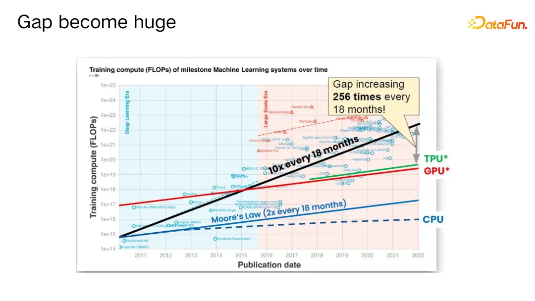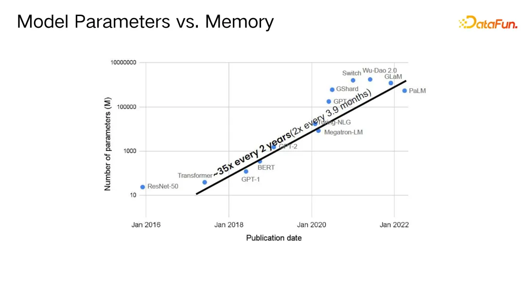 当前,一个规模达到 5400 亿参数的大模型可能需要接近 2T的显存,其成本极其高昂。同时,尽管单设备算力经常有所提升,但整体算力需求增长速度更快,在过去 18 个月内,算力需求甚至增加了约十倍,从 10 的 23 次方到 10 的 24 次方量级。