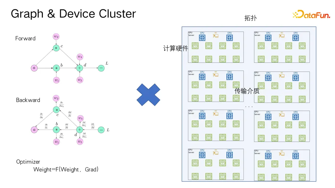 面对这些挑战,我们需要关注模型在整个集群中的定位、计算流程及其复杂性。深度学习过程主要包括前向传播、反向传播和优化器计算,在大规模集群环境下,网络拓扑结构、硬件间的通信带宽以及不同层级的访问速度都成为设计的关键考量因素。此外,如何优化 CPU 与 GPU 协同工作,提高数据读取预处理和 off-load 任务的效率,以及解决多层交换机下的节点间通讯复杂性,都是分布式大规模训练的重大技术难题。
