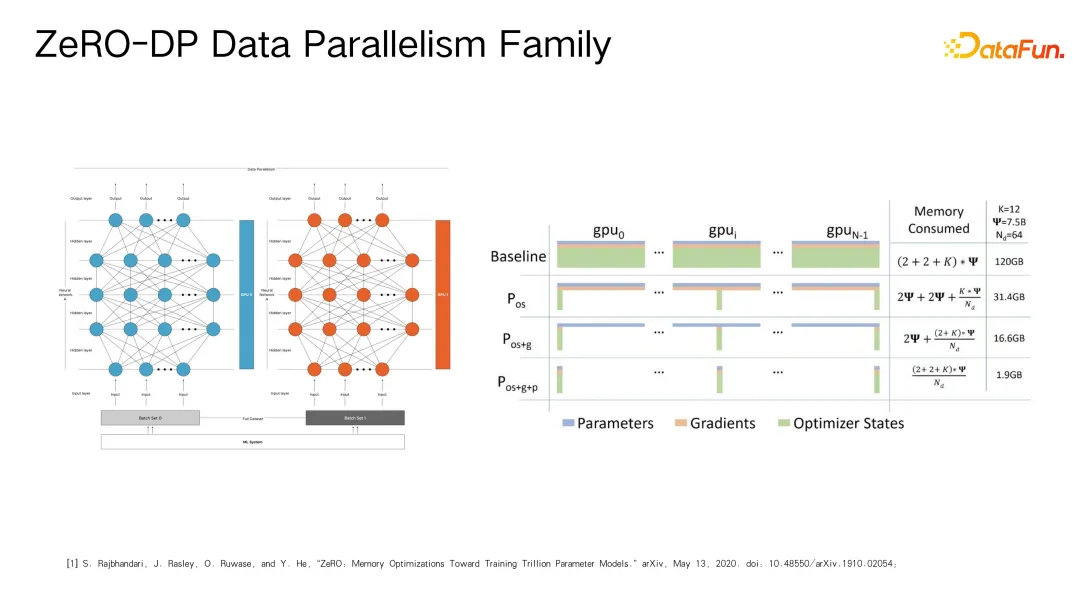 接下来的重点为数据并行层面,比如微软推出的 DeepSpeed 框架,其核心技术旨在解决大规模分布式训练时的显存占用问题。研究人员发现,显存瓶颈主要包括两大部分:一是参数服务器存储的模型参数、梯度及优化器状态;二是零冗余优化(Zero Redundancy Optimization, ZeRO)相关的显存占用,包括激活函数计算过程中的临时显存分配。
