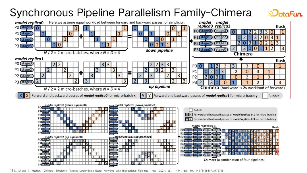 在同步训练方面,还有更为激进的方法,例如某位华裔学生的研究,尝试解决一个与传统思路不同的问题,即在考虑时序图时,并不局限于从零到一或从一到零的单向顺序执行。例如,在处理 micro-batch 时,同时利用两个方向进行数据传输和计算,就像在一个双向通道上操作一样。具体来说,设想在设备间构建一个双向通信链路,以 micro-batch 为例子,可以实现数据既从 device 这一端流入流出,也能从另一个方向传递。这样,在对时序进行合理安排、优化 stage 编排时,比如将原本的阶段细分为四个部分,就能够进一步提升整个系统的利用率,包括压缩 pipeline 空间占用的时间,从而实现更高效地运行。