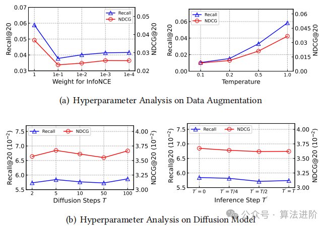 我们研究了DiffKG的超参数,特别是𝜆1(InfoNCE损失权重)和𝜏(softmax温度)。最佳性能出现在𝜆1=1和𝜏=1时,强调了对比学习的重要性。在知识图扩散模型中,增加扩散步数对精度的影响最小,如图3(b)。为了平衡性能和计算,我们选择了T=5。有趣的是,最佳性能在T′=0时实现,这避免了原始KG的过度损坏。