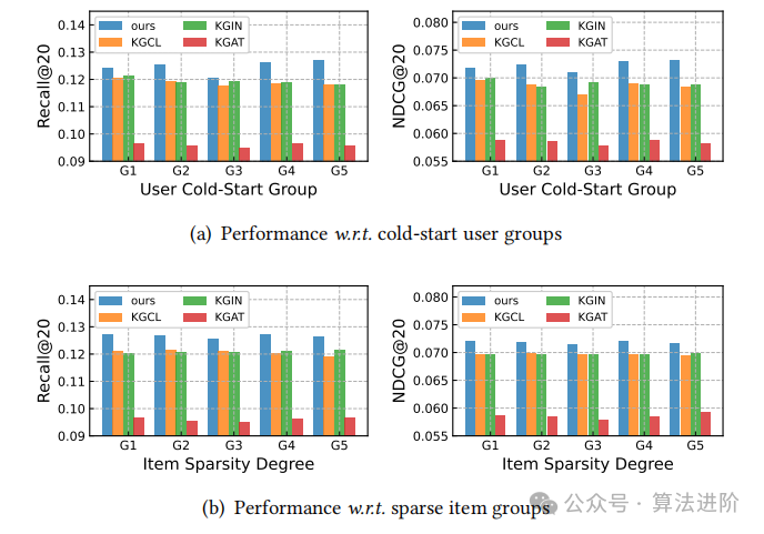 稀疏的用户交互数据。为了评估DiffKG在稀疏数据处理方面的性能,我们将用户和项目分为五组,每组包含相同数量的用户,交互密度从组1到组5逐渐增加,代表不同程度的稀疏性。采用类似的方法处理物品,测试结果如图4所示。
