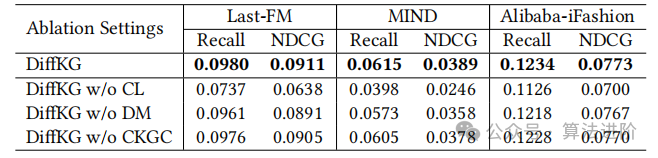 本研究评估了DiffKG中关键模块的有效性,开发了三种模型变体:“w/o CL”(删除KG增强数据增强模块),“w/o DM”(用变分图自动编码器替换扩散模型),“w/o CKGC”(从KG扩散模型优化中排除协作知识图卷积)。
