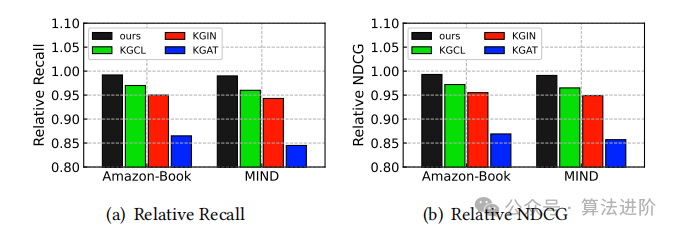在长尾项目分布的推荐场景中,DiffKG显著提高了推荐性能,有效减轻了流行度偏差。与其他基线方法相比,DiffKG在推荐性能上优于KGAT和KGIN等竞争性KG感知推荐系统。这表明,简单地将所有KG信息纳入协同过滤可能会引入不相关项目关系的噪声,且无法有效缓解流行度偏差。