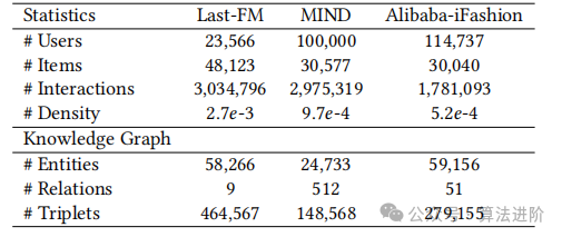 为了评估的全面性和多样性,我们采用了三个公共数据集:Last-FM(音乐)、MIND(新闻)和Alibaba-iFashion(电子商务)。经过10核技术预处理,过滤掉出现次数低于10的用户和项目。对于Last-FM,我们采用映射方法关联项目与Freebase实体并提取知识三元组。对于MIND,我们遵循[24]收集维基数据的KG。对于Alibaba-iFashion,我们手动构建KG,利用类别信息作为有价值的知识。三个数据集及其对应的KG的详细统计数据如表1所示。