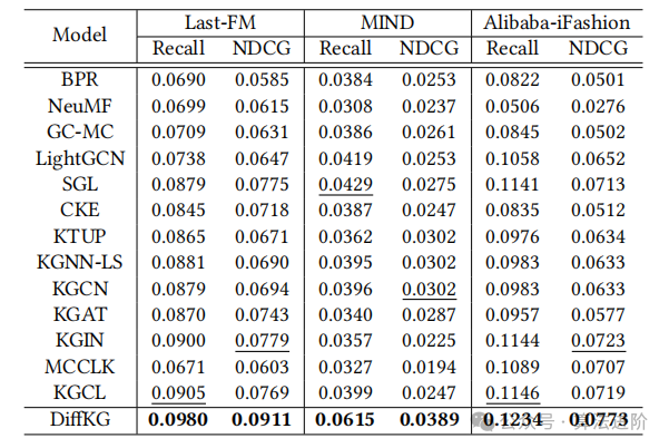 为了全面评估DiffKG,我们将其与不同研究流的一组基线进行了比较。