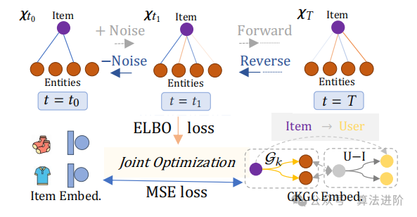 如图2,知识图(KG)扩散包含正向和反向两个过程,并可应用于知识图谱。我们使用邻接矩阵来表示知识图谱,其中项目与实体集Σ中的实体的关系由二进制值指示。前向过程中,知识图谱的原始结构通过逐步添加高斯噪声而被破坏,初始状态为项目的原始邻接矩阵。在马尔可夫链中,通过在T步逐渐添加高斯噪声,构造𝝌1:T。参数化从𝝌𝑡−1到𝝌𝑡的过渡为: