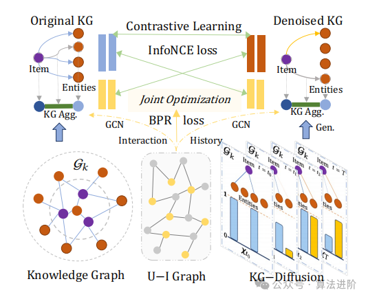 将生成扩散模型与知识图学习框架集成,专为知识感知推荐设计,有效结合知识感知项目的语义和用于推荐目的的协作关系模型。