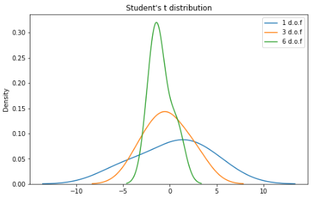 n 是称为“自由度”的参数,有时可以看到它被称为“d.o.f.” 对于较高的 n 值,t 分布更接近正态分布。