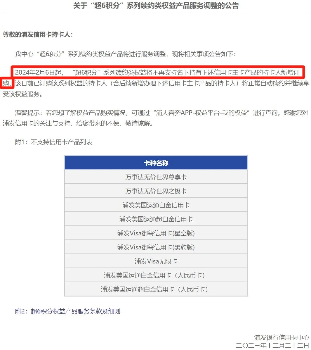 去年12月22日,浦发发布了公告,对旗下信用卡“超6积分”系列续约类权益产品进行服务调整: