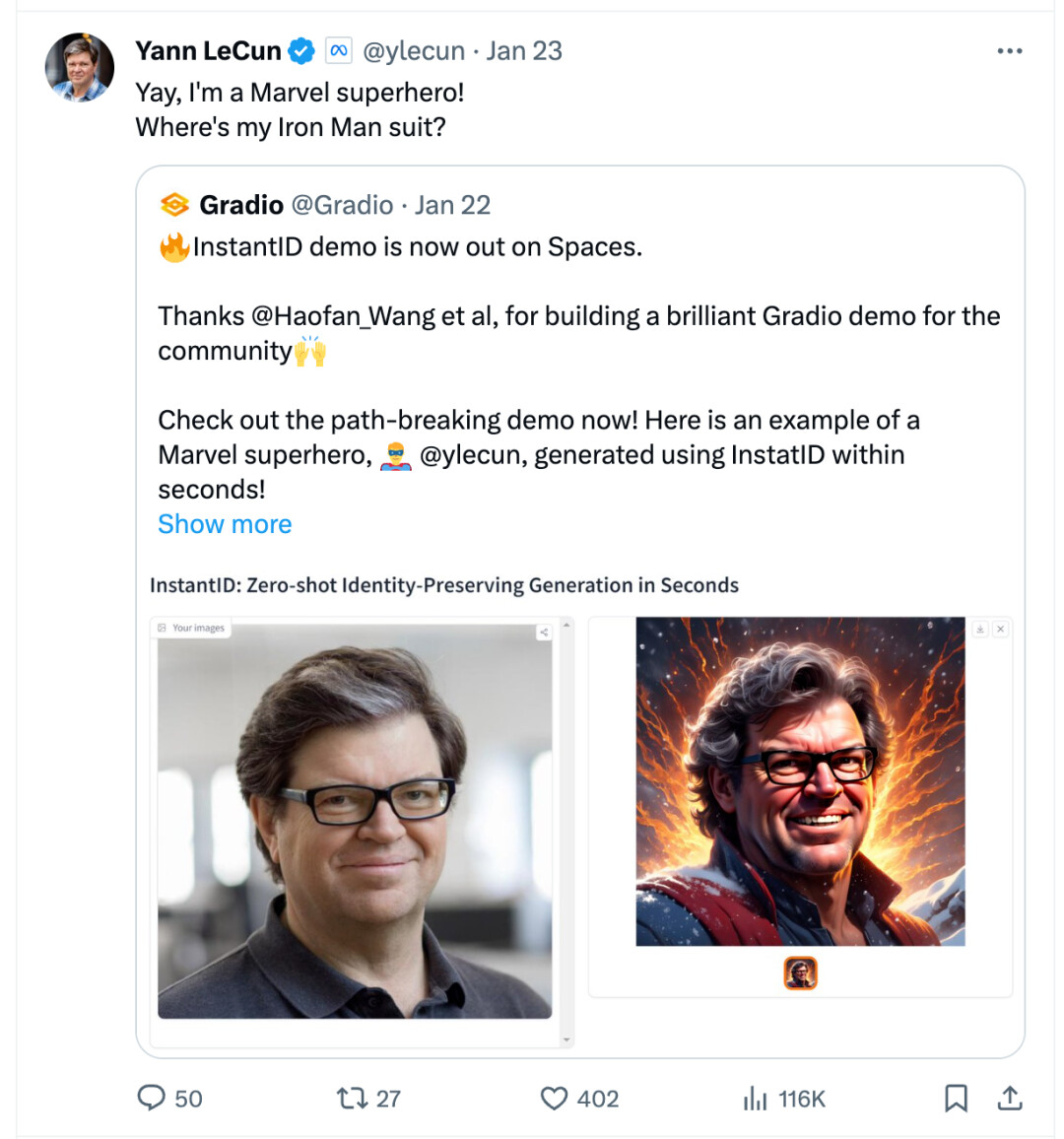 就连 Yann LeCun 本人也点赞转发,调侃自己的「钢铁侠」衣服在哪里。