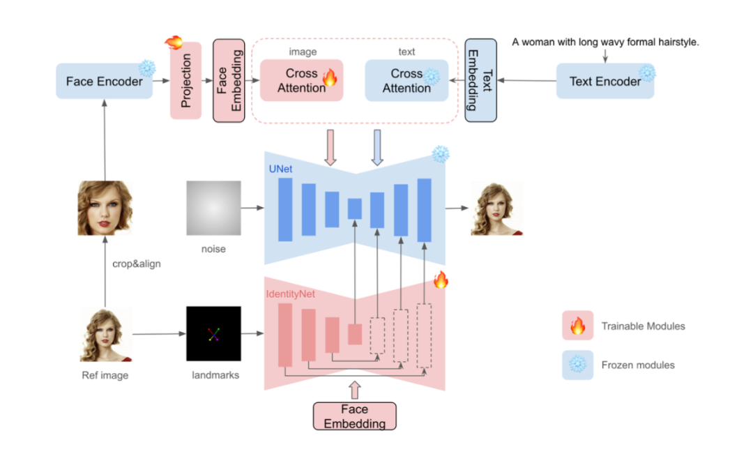 IdentityNet:小红书提出了一个名为 IdentityNet 的网络,是 InstantID 的核心部分。它通过强语义条件(如面部特征的详细描述)和弱空间条件(如面部关键点的位置)来编码参考面部图像的复杂特征。在 IdentityNet 中,生成过程完全由 Face Embedding 引导,无需任何文本信息。仅更新新添加的模块,而预先训练的文本到图像模型保持冻结以确保灵活性。