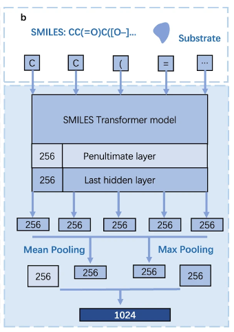 底物结构表示模块 (Substrate structure representation module),使用预训练语言模型 SMILES Transformer model 对底物的信息进行编码。底物结构被转换为 SMILES 格式,进而通过预训练的 SMILES 转换器生成一个 1,024 维的向量,并对最后一层和倒数第二层的第一个输出进行均值和最大池化,最终生成一个 1,024 维的向量来表示底物的结构信息(如上图所示)。