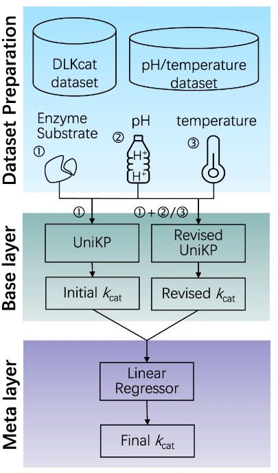 基础层包含两个独立模型——UniKP 和 Revised UniKP。UniKP 以蛋白质和底物的连接表示向量作为输入,而 Revised UniKP 使用蛋白质和底物的连接表示向量、结合 pH 或温度值作为输入。