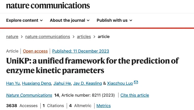 中国科学院深圳先进技术研究院罗小舟团队提出了,基于酶动力学参数预测框架 (UniKP),实现多种不同的酶动力学参数的预测。