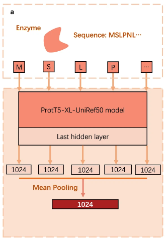 其中,酶序列表示模块 (Enzyme sequence representation module), 使用预训练语言模型 ProtT5-XL-UniRef50 对酶的信息进行编码,每个氨基酸通过该模型被转换为一个 1,024 维的向量,并通过均值池化 (averaged by mean pooling) 进行处理,最终生成一个 1,024 维的向量来表示整个酶的序列信息(如上图所示)。
