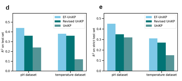 在测试集上,EF-UniKP 相较于 UniKP 和 Revised UniKP 表现更佳。在 pH 数据集测试中,EF-UniKP 的 R² 分别高出 20% 和 8%,在温度数据集测试中,EF-UniKP 的 R² 分别高出 26% 和 2%。在酶和底物至少有一个不在训练集的测试中,EF-UniKP 在 pH 数据集上的 R² 值相较于 UniKP 和 Revised UniKP 分别高出 13% 和 10%,在温度数据集上分别高出 16% 和 4%。
