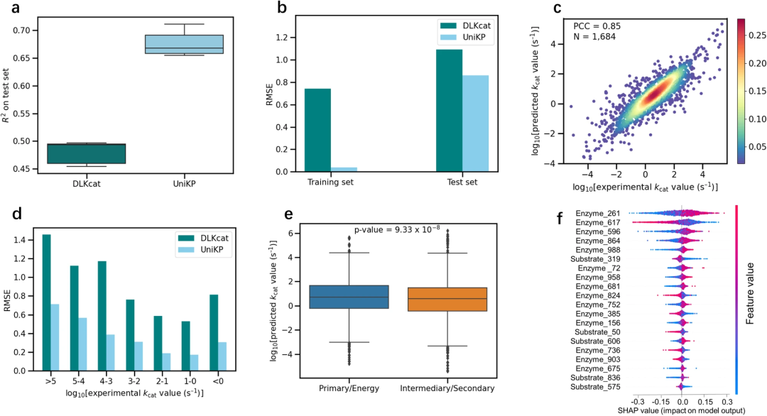 研究团队在 kcat 预测任务上使用 DLKcat 数据集对 UniKP 框架进行了验证,该数据集包含 16,838 个样本。在 5 轮随机划分的测试集验证中,UniKP 的 R² 值为 0.68,比 DLKcat 提高了20%。此外,在测试中,DLKcat 的最高值比 UniKP 的最低值低了 16%,进一步证明了 UniKP 的稳健性。