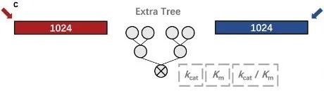 结果显示,集成性模型表现出更好的性能,尤其是随机森林 (random forests) 和极端随机树 (extra trees) 显著优于其他模型,其中极端随机树表现最佳 (R²=0.65)。如上图所示,机器学习模型以连接表示向量为输入,生成预测的 kcat、Km 或 kcat / Km 值。