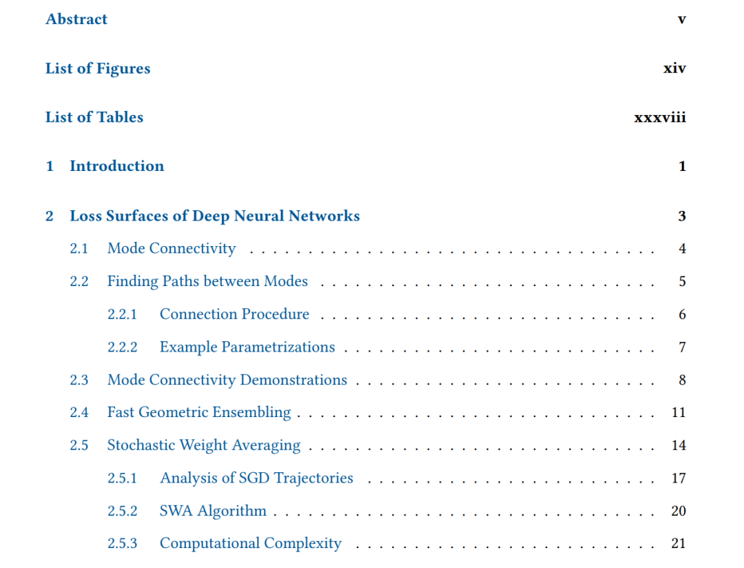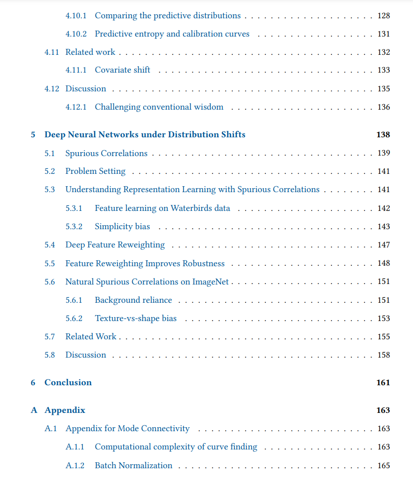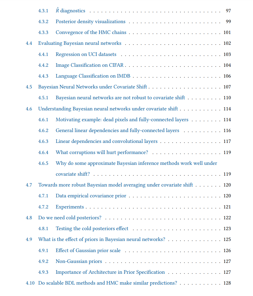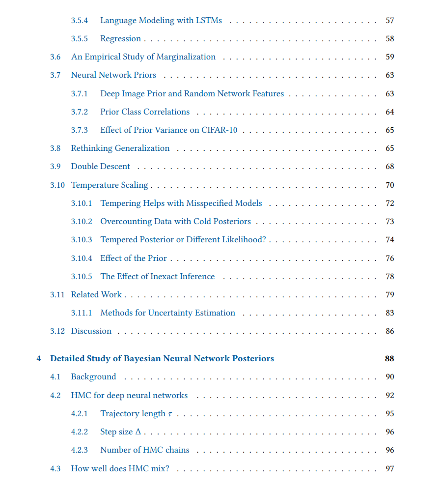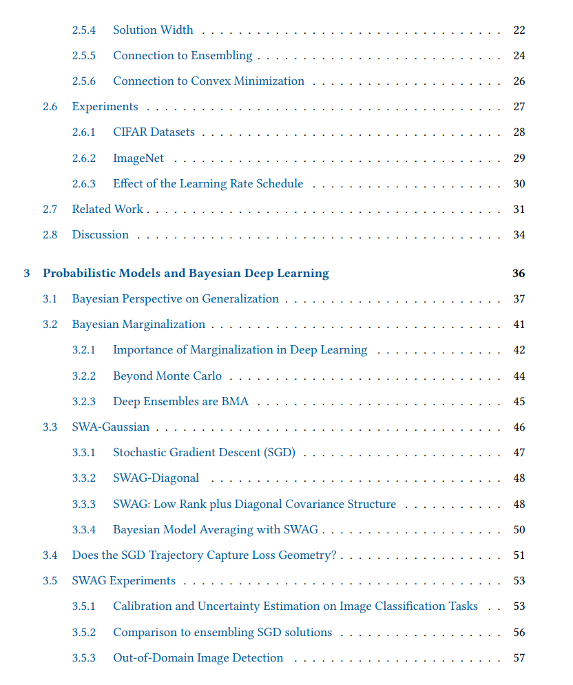 本论文的其余部分安排如下。在第2章中,我介绍了神经网络损失表面中最优解集合的结构。我还提出了基于对损失表面的观察而激发的深度神经网络改进训练和快速集成的实用方法。在第3章中,我展示了贝叶斯神经网络的广泛阐述以及对泛化的概率视角。我还提出了改进深度神经网络不确定性估计的实用方法。在第4章中,我报告了对贝叶斯神经网络后验分布的详细科学研究结果,提出了许多挑战传统智慧的惊人观察。特别是,我描述了导致贝叶斯神经网络在分布偏移下表现不佳的确切机制,并提出了部分解决方案。在第5章中,我描述了我们在存在捷径特征的情况下神经网络的特征学习工作,以及减少对这些特征依赖的方法。最后,在第6章中我总结了这篇论文。