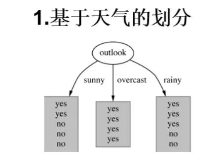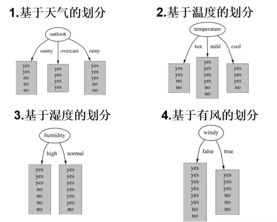 这是数据(14天的打球情况),有四种环境特征(outlook,humidity),最后一列(play)代表最后有没有出去打球。「首先,选择根节点」。一共有四个特征,所以根节点的选择有四种。