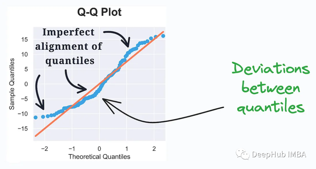 它评估观测数据与理论分布之间的分布相似性。绘制了两个分布的分位数。偏离直线表示偏离假定的分布。