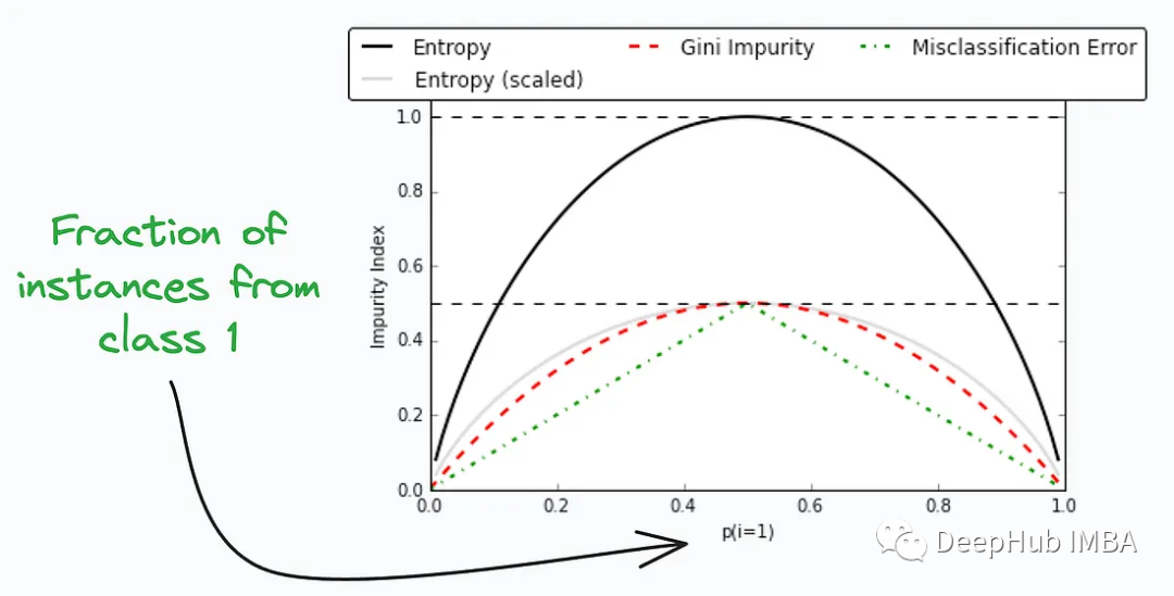 它们用于测量决策树中节点或分裂的杂质或无序。上图比较了基尼不纯和熵在不同的分裂,这可以提供了对这些度量之间权衡的见解。