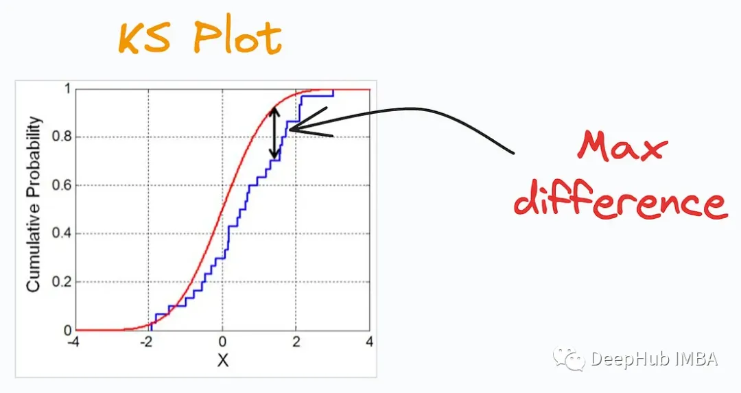 KS Plot用来评估分布差异。其核心思想是测量两个分布的累积分布函数(CDF)之间的最大距离。最大距离越小,它们越有可能属于同一分布。所以它主要被解释为确定分布差异的“统计检验”,而不是“图”。