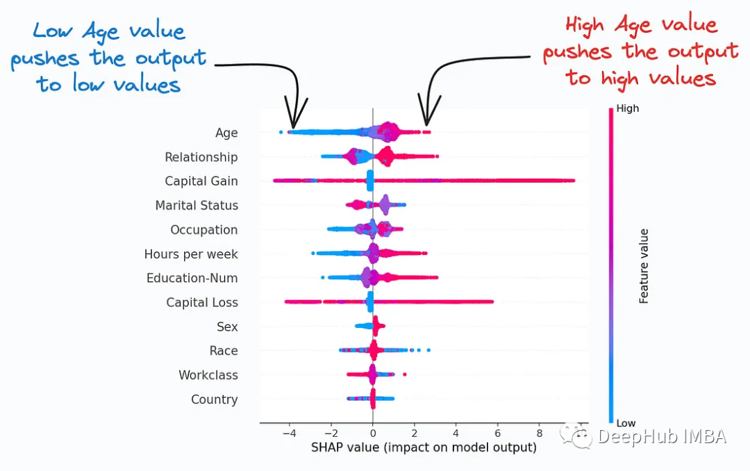 通过考虑特征之间的相互作用/依赖关系来总结特征对模型预测的重要性。在确定一个特征的不同值(低或高)如何影响总体输出时很有用。