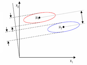 。假设按下图中的方向来投影,投影中心对应的原来高维点分别是μ1,μ2。由于希望属于不同类的样本尽可能离的远,那么就希望投影过后的投影中心点离的尽可能远,即目标是