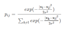 即 xj 在 xi 高斯分布下的概率占全部样本在 xi 高斯分布下概率的多少,说明了从 xi 角度来看两者的相似程度。接着令 pij =(pi|j+pj|i)/2n用这个概率来作为两个点相似度在全部样本两两相似度的联合概率 pij 。公式如下,论文没有解释σ是标量还是矢量,但是因为在后续的求解中 pij 不是直接由下面这个联合概率公式求出,而是通过前面的条件概率来求,前面的式子针对每一个样本i都会计算一个σi,具体给定一个确定值