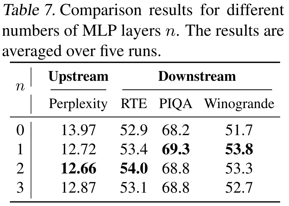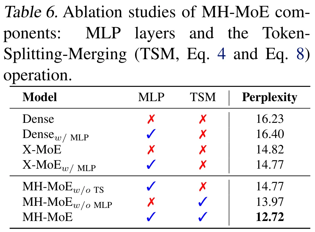 表 5、6、7 给出了研究结果。整体而言,MH-MoE 各组件的效果得到了验证,并且他们也得到了一些有趣的结果,比如从表 7 可以看出单层 MLP 足以实现 token 分割和融合。