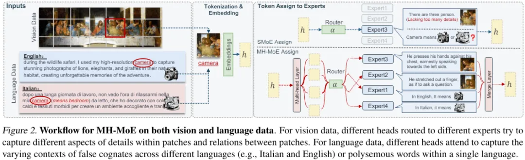 图 2 展示了 MH-MoE 的工作流程。可以看到,当输入单个 token 时,MH-MoE 会将其分成 4 个子 token,进而激活 4 个专家,而 SMoE 仅激活 1 个专家。