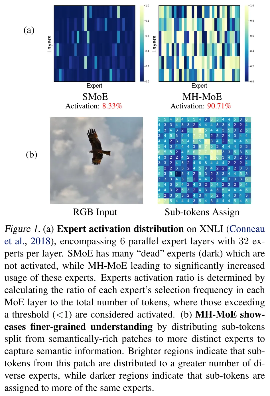 具有更细粒度的理解能力。MH-MoE 采用的多头机制会将子 token 分配给不同的专家,从而可以联合关注来自不同专家的不同表征空间的信息,最终获得更好更细粒度的理解能力。举个例子,如图 1b 的明亮区域所示,子 token 会被分配给更多样化的一组专家,这有助于捕获语义丰富的信息。